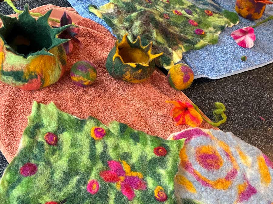 Filzen in Bensheim, Weinheim, Darmstadt und Umgebung: Einen ganzen Samstag können Sie mit farbenfroher Schafswolle fantasievoll und kreativ unter Anleitung eigene Kunstwerke filzen: Taschen, Hüte, Hausschuhe, Wandbilder, Puppen und vieles mehr. Maximal nehmen 6 Personen in einem Kurs teil; wir sind also eine kleine Gruppe.